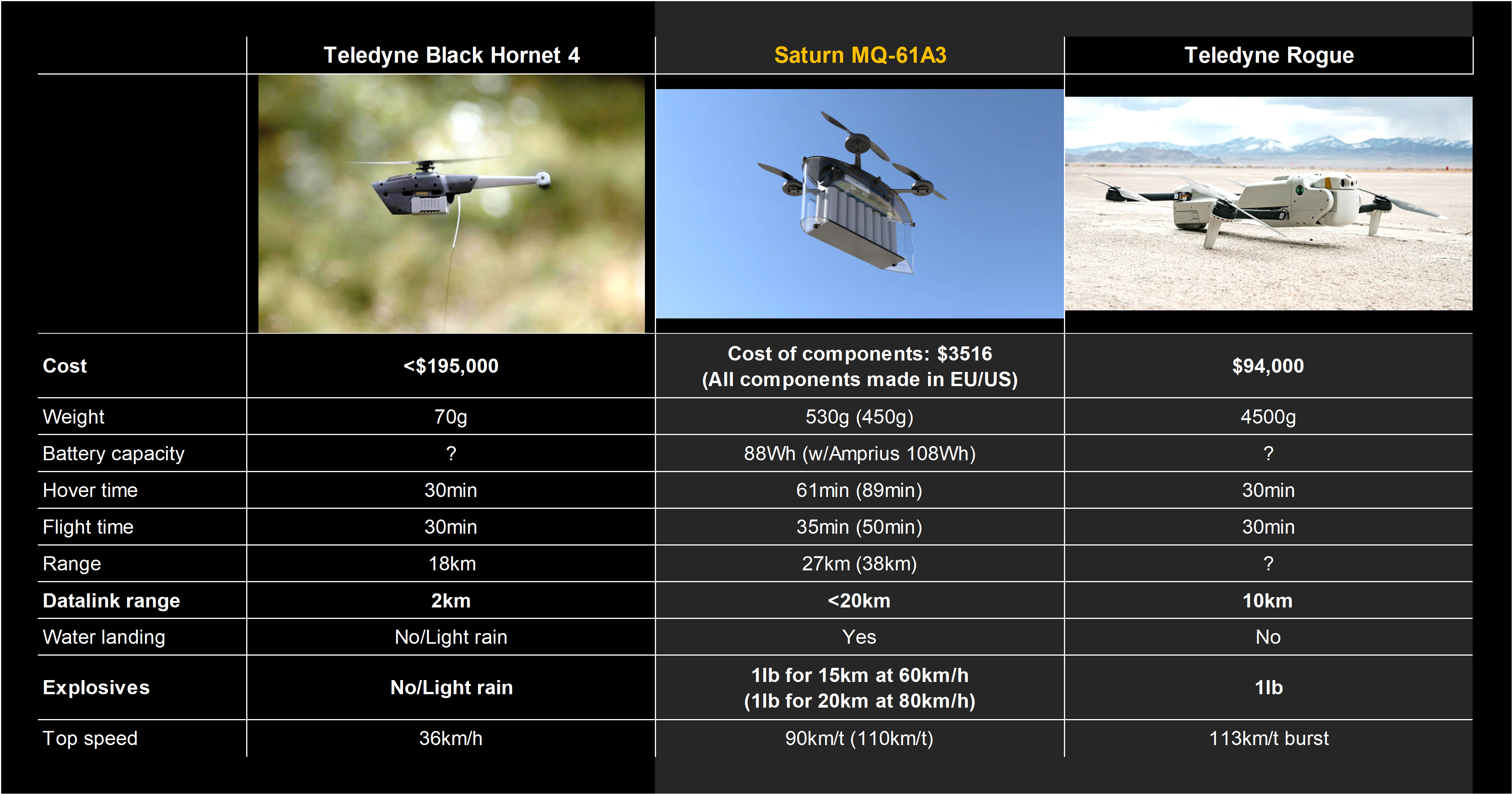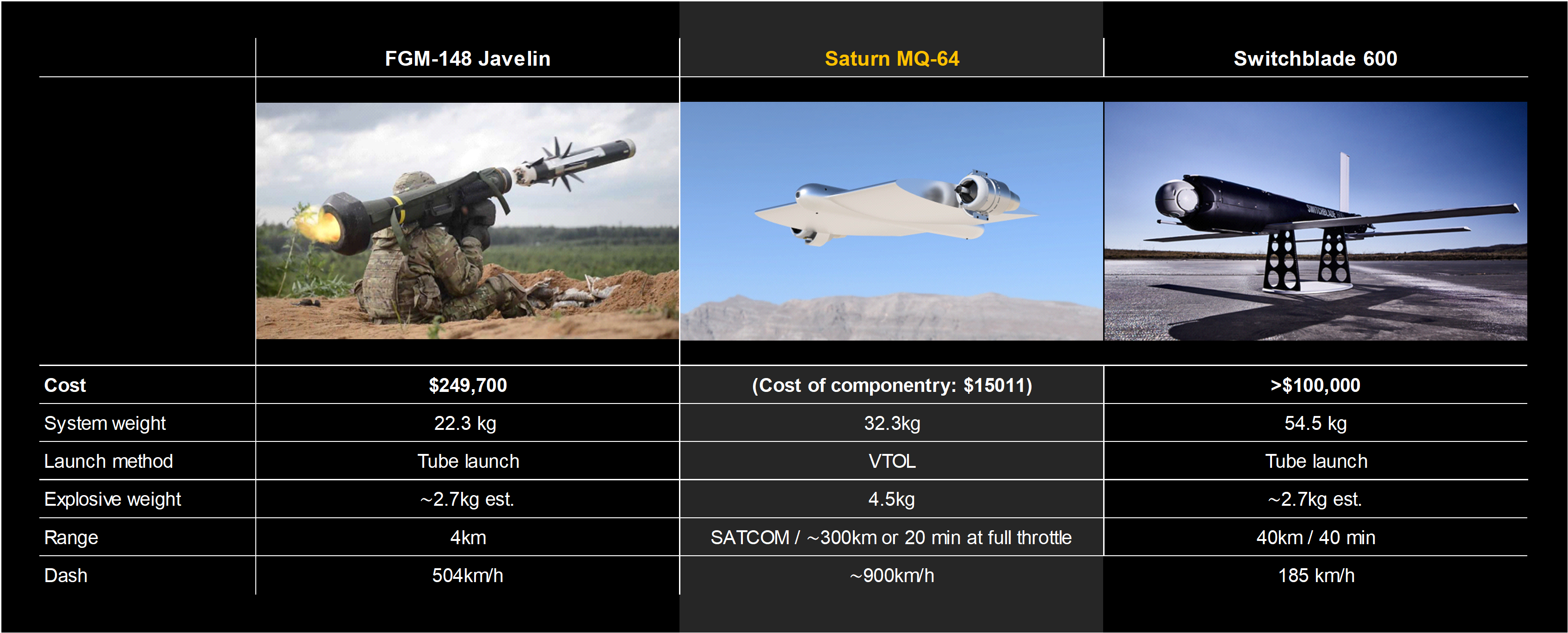 SATURN MQ-64 serves both as an anti-tank loitering munition and a surveillance UAV, outperforming competing systems. It features beyond-line-of-sight deployment and VTOL capabilities, offering superior range and cost efficiency.